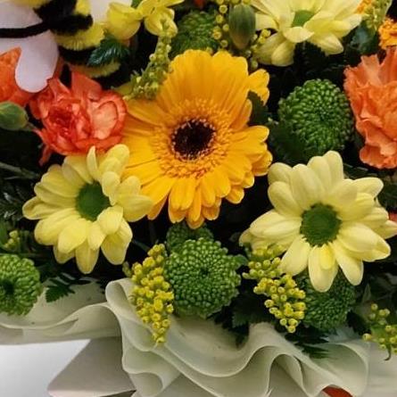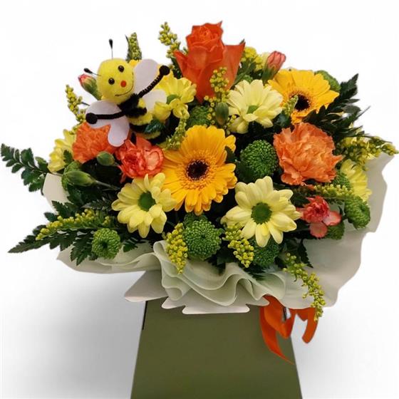 Pre-arranged in floral foam and incorporating a Bee pick.