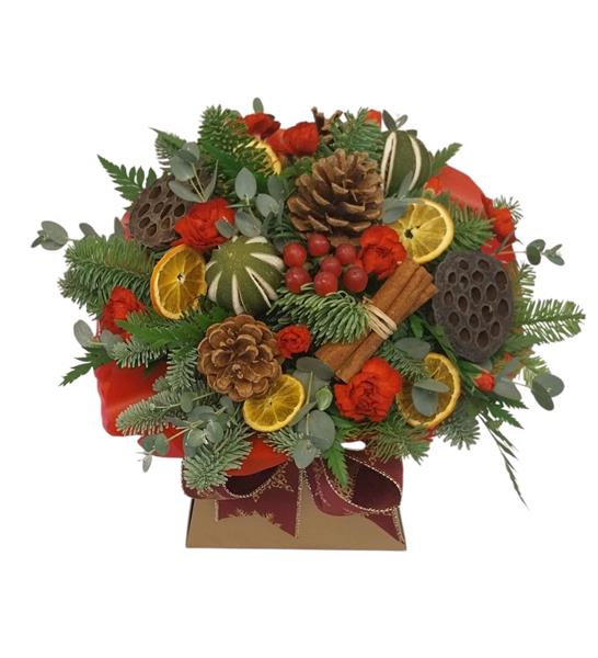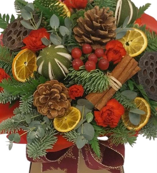 This design epitomises Christmas and the wonderful scents we associate with this joyful time. Filled with an array of dried festive fruits and decorations with pops of red spray carnations.