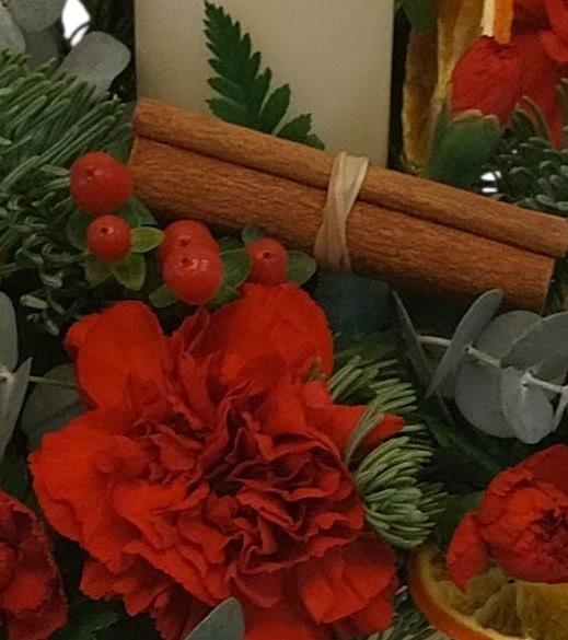 Traditional colour scheme of reds and gold featuring red carnations, spruce and dried decorations this makes a wonderful gift.