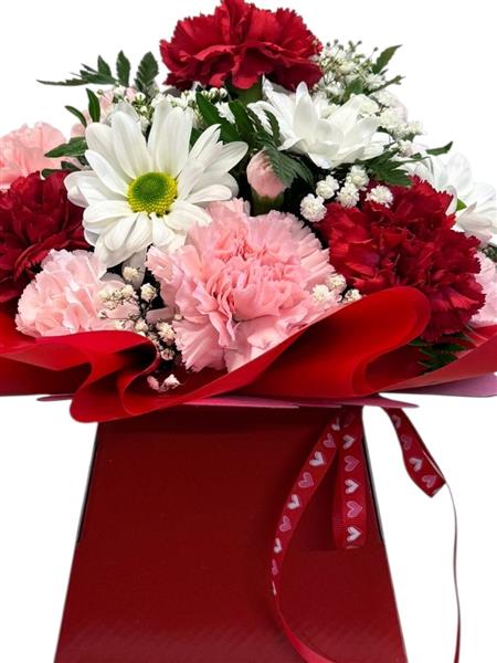 A pretty petite gift box of red and pink carnations, with white Chrysanthemums and gypsophilia.