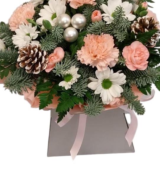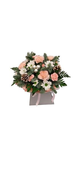 A pretty festive arrangement featuring beautiful fresh blooms in a palette of pink and white with seasonal decorations.