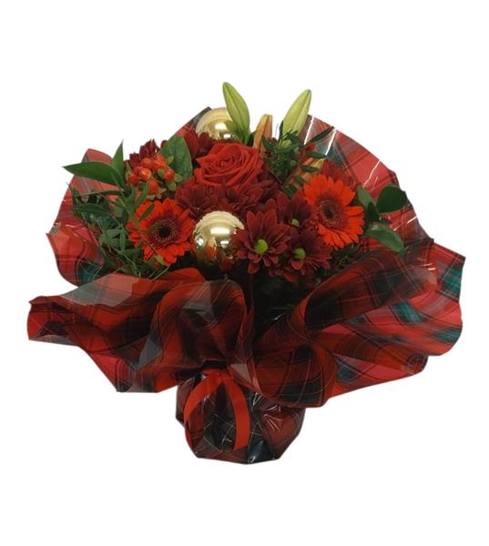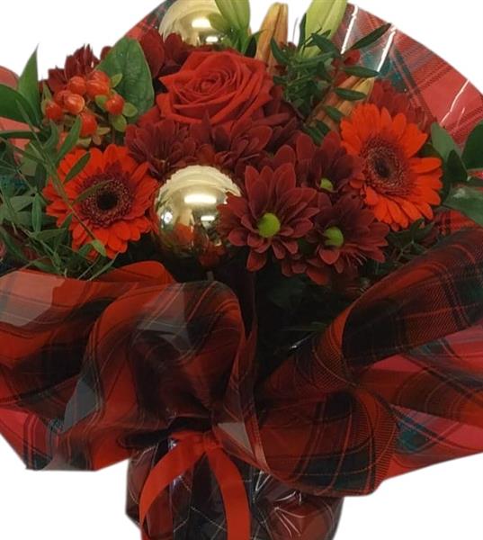 These flowers are arranged in a vase and presented in festive Tartan wrap and bow.