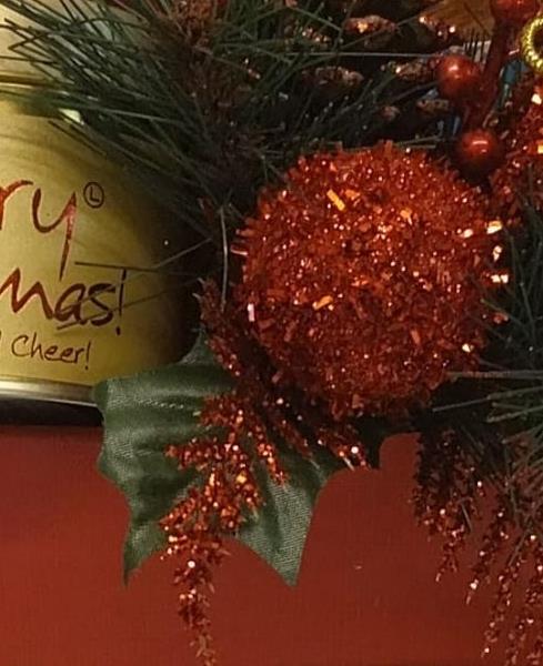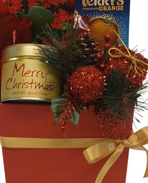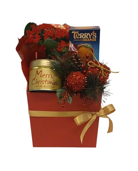 features: Red Kalenchoe, Festive candle (may differ from one pictured) a 'Terrys' chocolate orange and festive pick. Displayed in a gift box with cellophane wrap and bow.