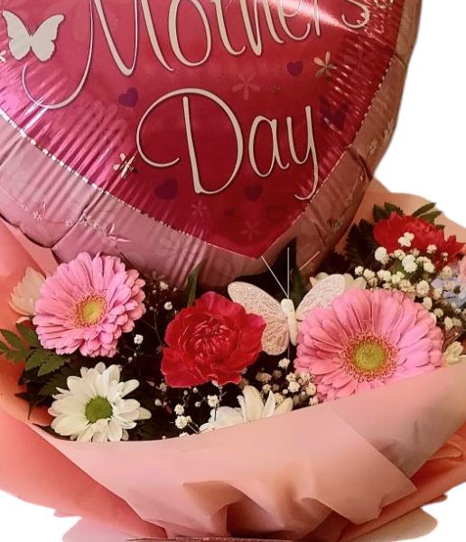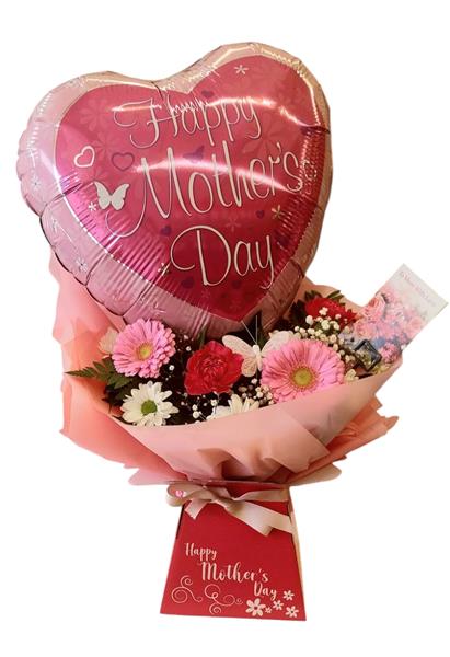 Happy mothers day balloon in a box with small floral arrangement.