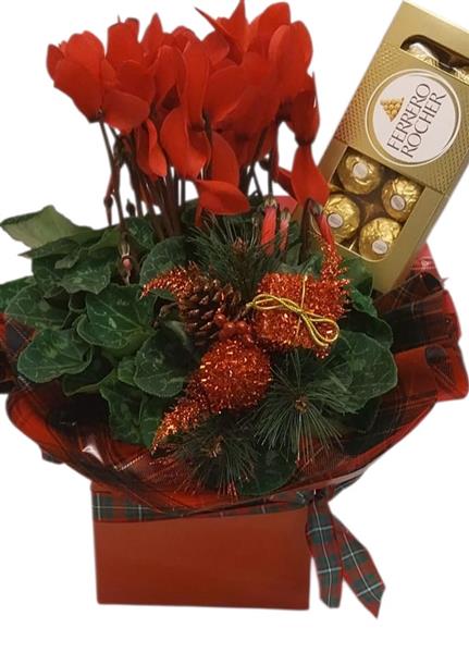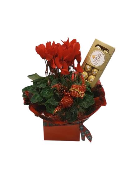 Large red cyclamen plant beautifully presented in Christmas cellophane and finished with a box of 8 Ferrero Rocher and festive pick.