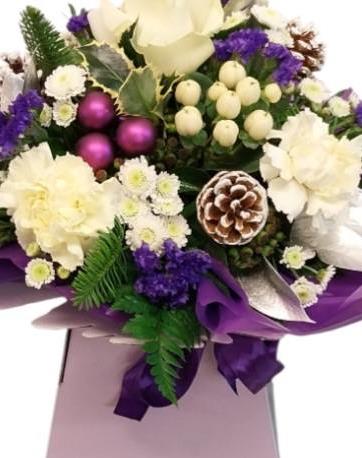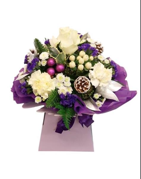 A beautiful gift box arrangement in hues of purples with cream and ivory flowers.