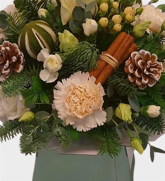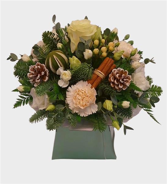 An elegant festive arrangement featuring beautiful fresh blooms in a soft, restful colour palette with seasonal dried decorations.