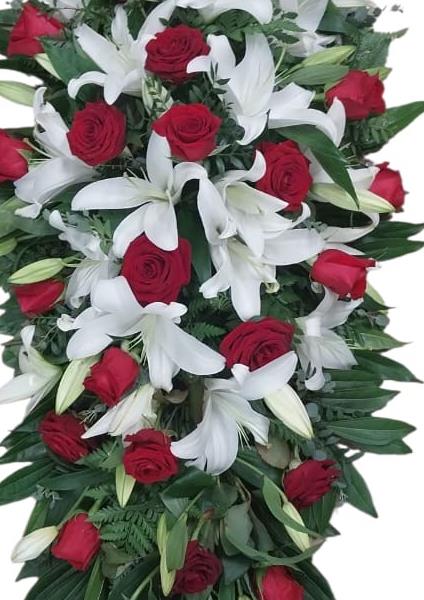 Elegant casket spray arranged in oasis featuring stunning red roses and white lilies.