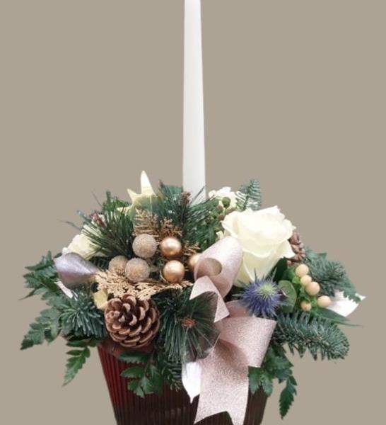 A beautifully arranged floral display in a copper coloured tin with muted pastel shades with seasonal dried decorations and hints of gold.