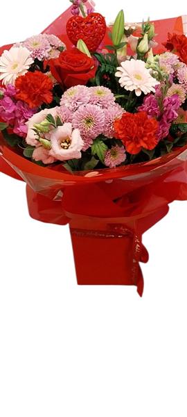 Hand crafted your bespoke bouquet will feature a mix of gorgeous fresh blooms in romantic hues of red, pink and cerise.