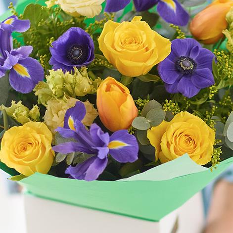 A selection of fresh blooms including at least three yellow roses and three purple iris, expertly handcrafted into a stunning bouquet.