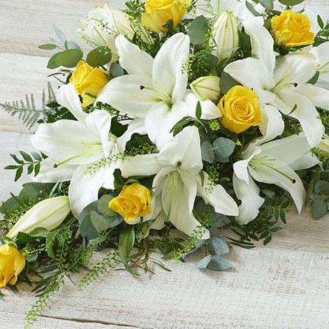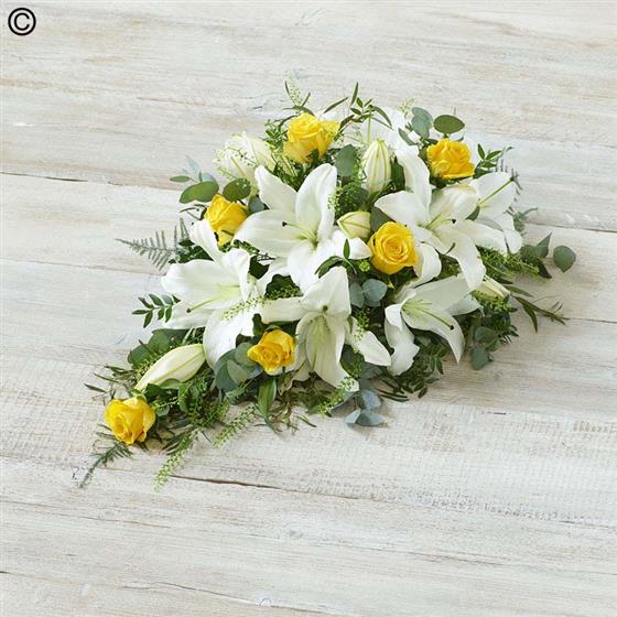 An elegant tear drop shaped arrangement featuring delicate foliage and large fragrant oriental lilies, combined with gorgeous roses.