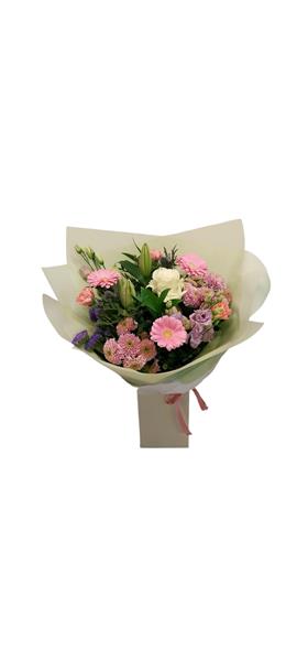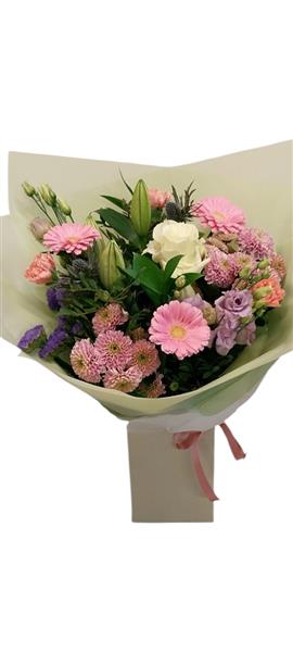 This beautiful bouquet features pretty soft pastel blooms in shades of pinks, lilac and cream and presented in a hand-tied aqua pack and gift box.