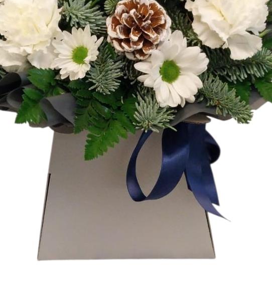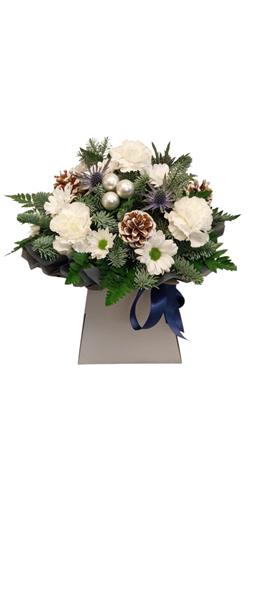 Silent night is a serene, wintry arrangement with white blooms, blue accents, seasonal foliage and decor.