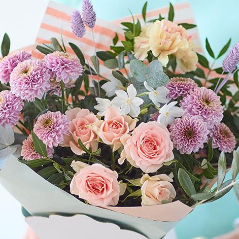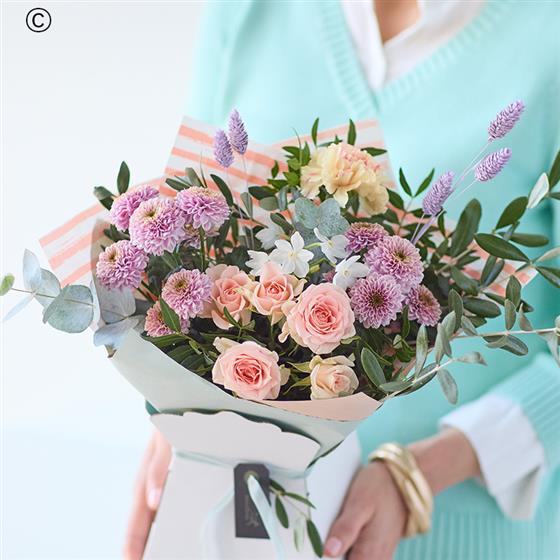 A budget-friendly giftbox with a handcrafted bouquet of pastel hued blooms inside.