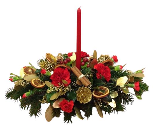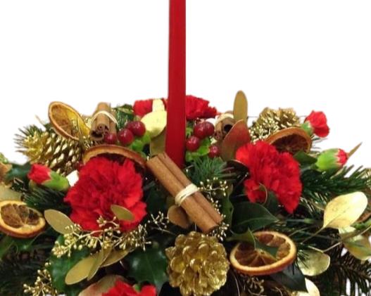 Traditional candle arrangement in reds and golds featuring festive decorations and seasonal foliage.