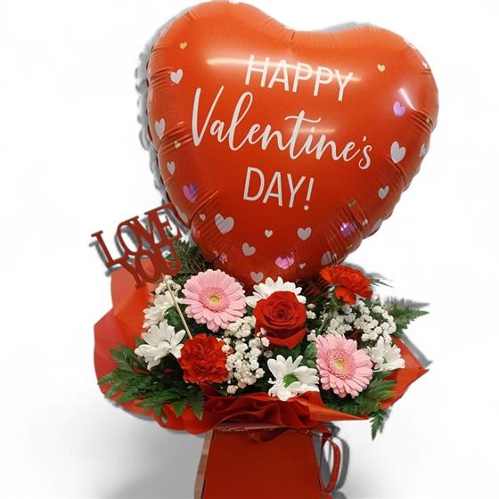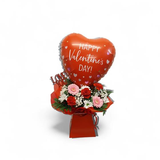 Arrangement designed in floral foam in a gift box incorporating a balloon with a red rose and red, pink and white flowers.