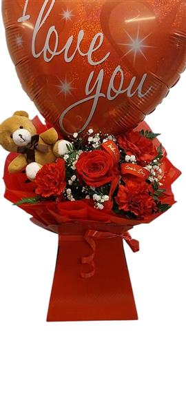 Arranged in floral foam this gift comprises of a single red rose with carnations, gypsophilia and foliage, Valentines ballon and bear pick.