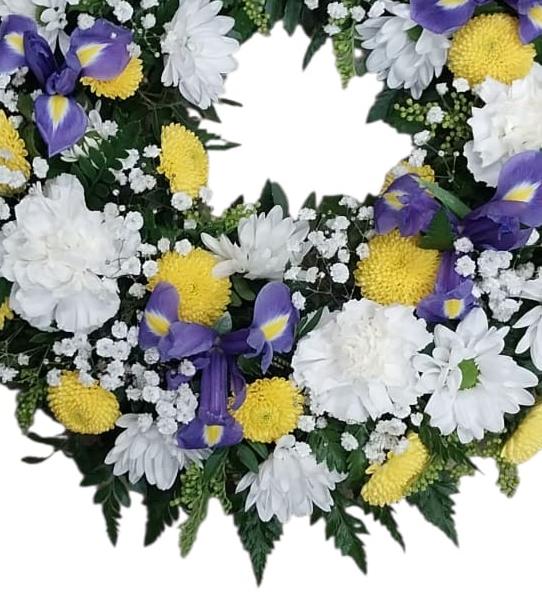 Traditional wreath on a 12 inch frame using seasonal flowers in a blue, white and yellow colour scheme.