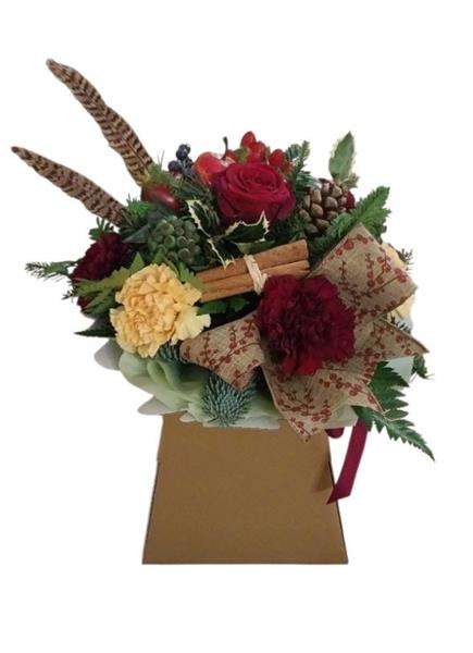 A beautiful arrangement in burgundy and gold carnations and a red rose with a festive fruit pick, dried decorations and pheasant feathers.
