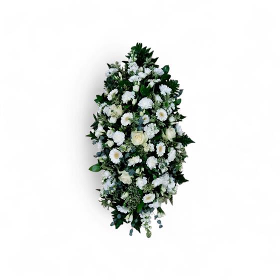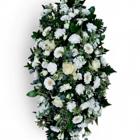 An elegant casket spray featuring seasonal white blooms chosen by our florist including roses.